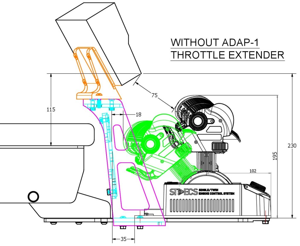 The VKB STEM module may be mounted centrally above the throttle on THTL-1 mount using a 3D printable Flying Bridge STEM Mount and a 3D printable STEM mount available at: Printables VKB STECS STEM Module (all credit to author) . Please check website comments regarding screw access prior to printing.