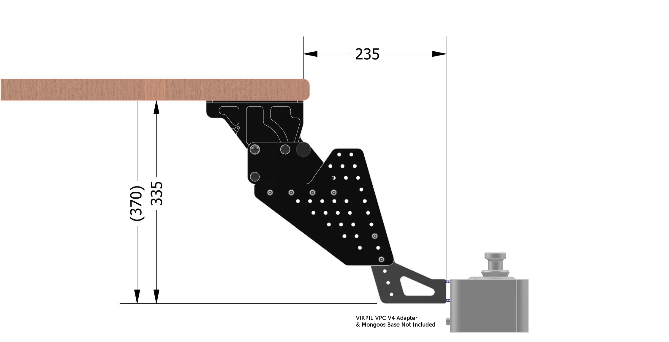 Positions the VIRPIL® V4 Adapter and Mongoos base at the same nominal position as the VIRPIL® Desk Mount V4. Includes 20mm pitched holes in the side plates for mounting peripherals.