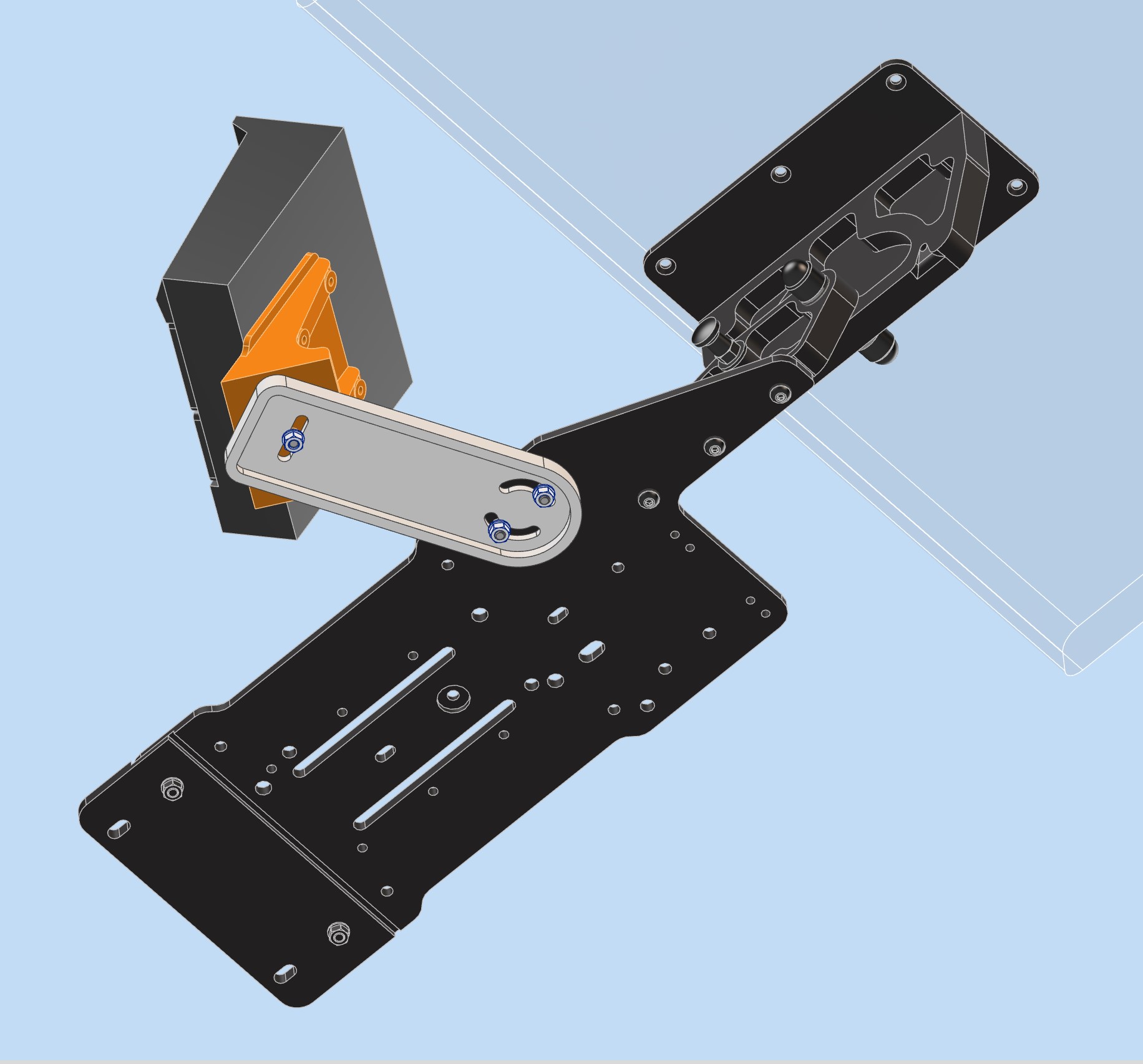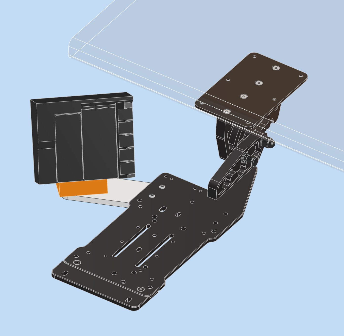During the design phase the primary goal of the Mach1 Mount design was to have a mount that would quickly stow, remain out of the way when not in use and provide a strong and sturdy platform for my HOTAS. The mount had to have a minimum number of parts, stow the HOTAS well out of the way, maintain a low profile and be built to last.